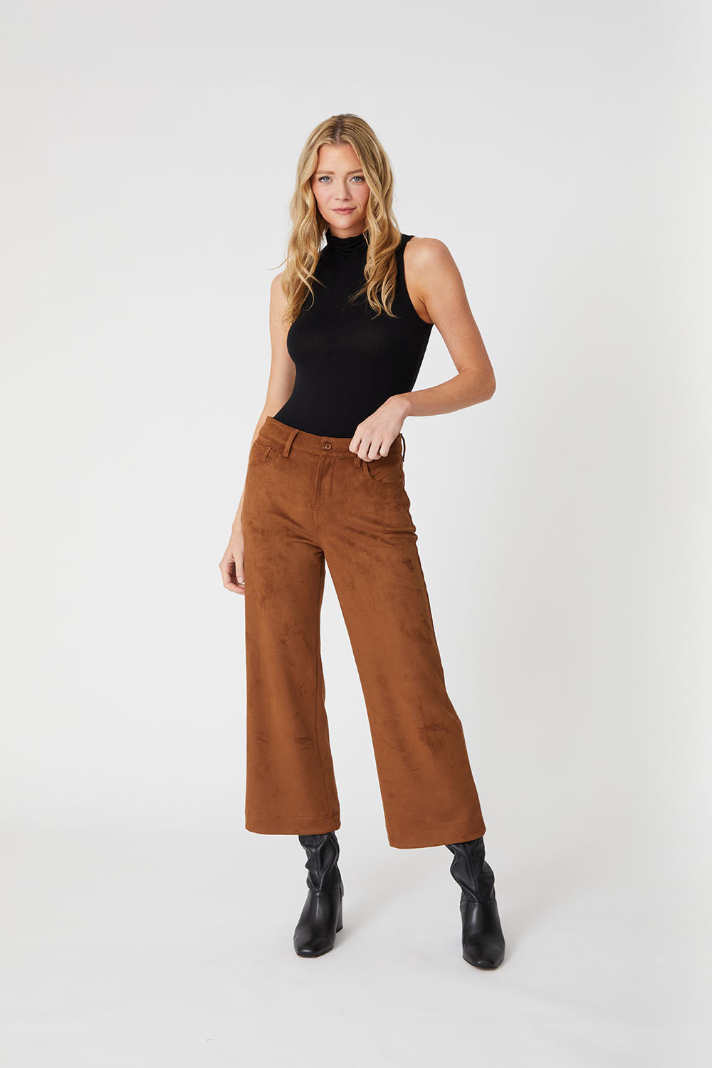 Goes with everything Annabelle pant is now in vegan faux suede. These easy 5 pocket midrise pant has an easy drape and a cropped wide leg. Simply effortless style for all day comfort.
